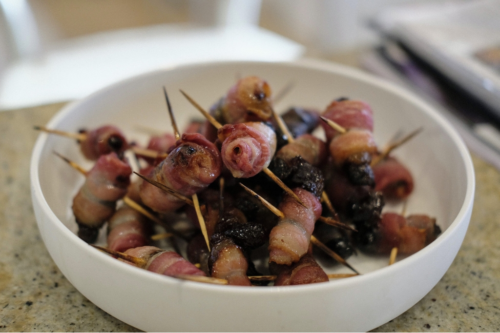 They’re equally quick and easy to prepare and are kin to the angels in that they’re also making use of crispy, salty bacon. Though instead of briny molluscs, the rashers wrap dried prunes, dates, or apricots.